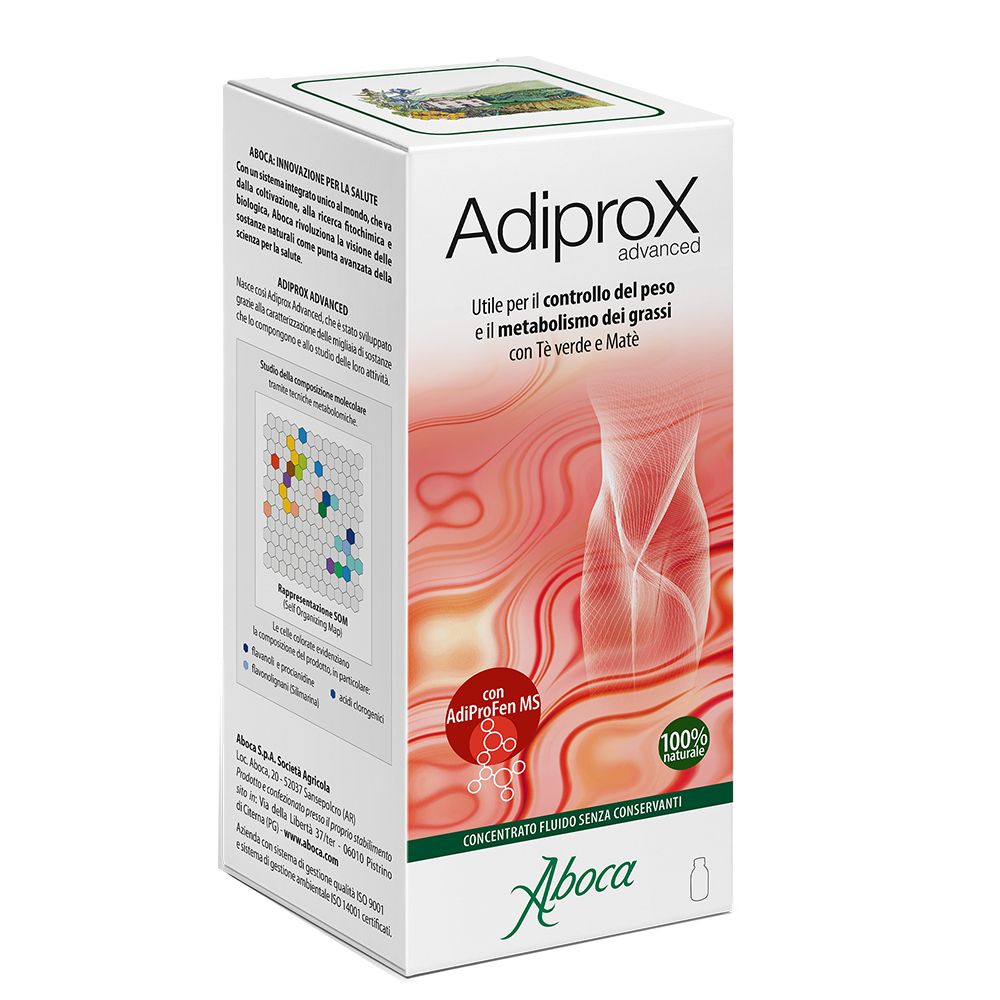 Dalle avanzate piattaforme scientifiche della Ricerca Aboca nasce Adiprox Advanced, con AdiProFen MS, innovativo complesso molecolare ricco in procianidine, acidi clorogenici, flavonolignanie flavanoli composti naturali che derivano da Tè verde, Matè, Cardo mariano e Semi d’uva. Adiprox Advanced contribuisce al controllo del peso grazie all’estratto liofilizzato di Tè verde utile per supportare il metabolismo basale, favorire la termogenesi e per sentirsi più energici. Questo estratto è unito a quello dei Semi d’uva che coadiuva la funzionalità del microcircolo e ha un’azione antiossidante. La formulazione è stata arricchita dall’estratto liofilizzato di Matè che ha un’azione più specifica sul metabolismo dei grassi favorendone la loro degradazione. Inoltre l’estratto di Cardo mariano è utile per la funzionalità del fegato, organo deputato anche alla gestione dei grassi all’interno dell’organismo.