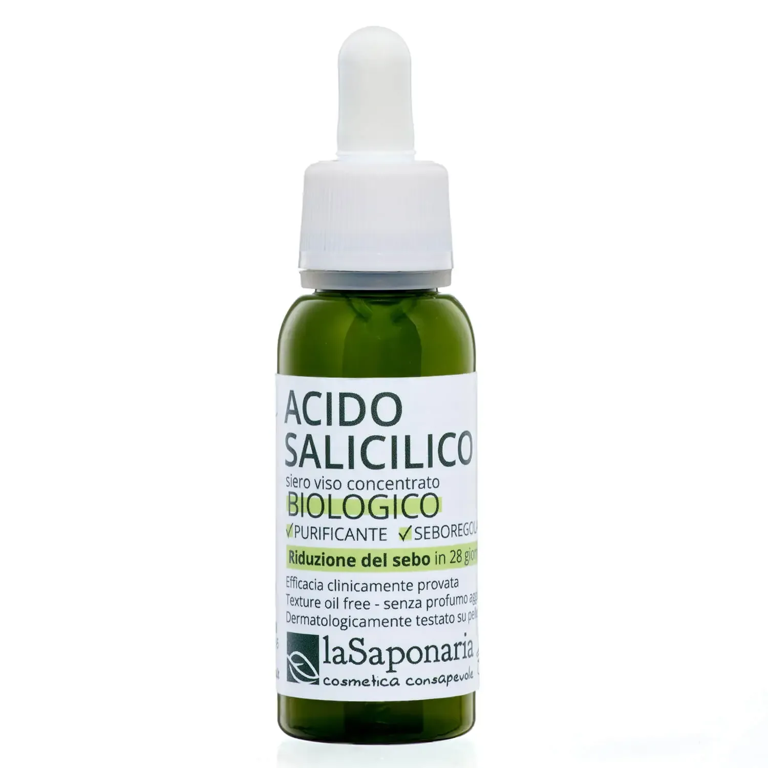 Siero viso concentrato certificato biologico formulato da Acido Salicilico, una molecola dotata di proprietà esfolianti che si rivela particolarmente utile in caso di acne o pelle impura.