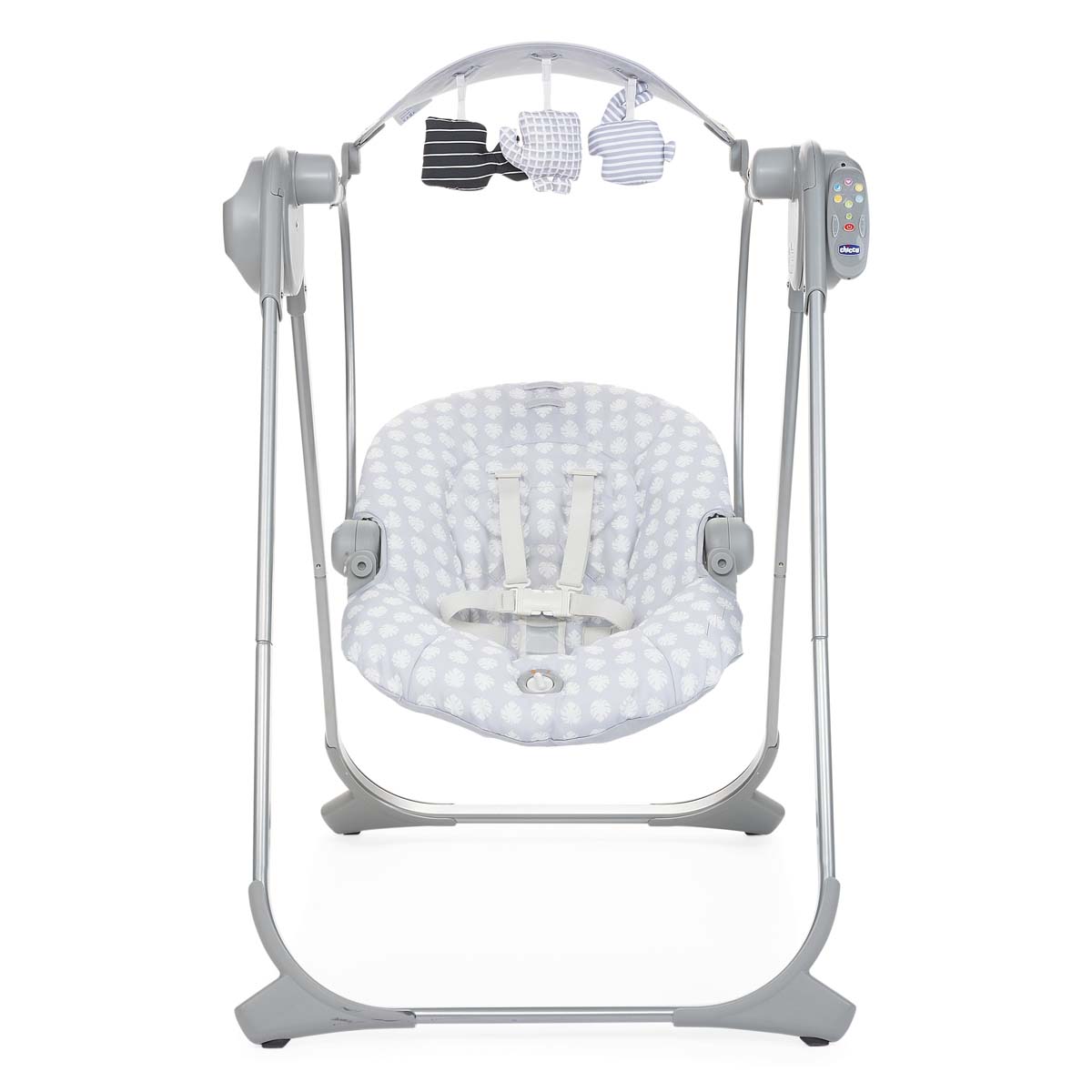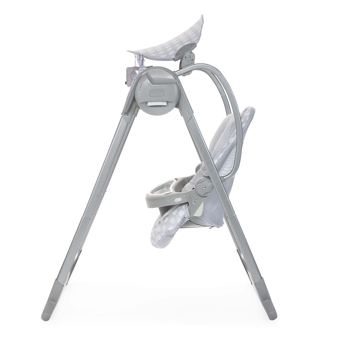 Polly Swing Up è l’altalena elettornica Chicco divertente e confortevole. Grazie al movimento a dondolo a 4 velocità, il bambino ha la possibilità di rilassarsi e di farsi cullare fin dai primi mesi. Il dondolio e le melodie possono essere attivate anche a distanza, grazie al telecomando, così potrai decidere in ogni momento come intrattenere il tuo piccolo. La barra giochi inclusa sviluppa la sensibilità musicale e la coordinazione manuale del bambino e la capote parasole regolabile permette di proteggere il bambino quando si trova all’aria aperta.