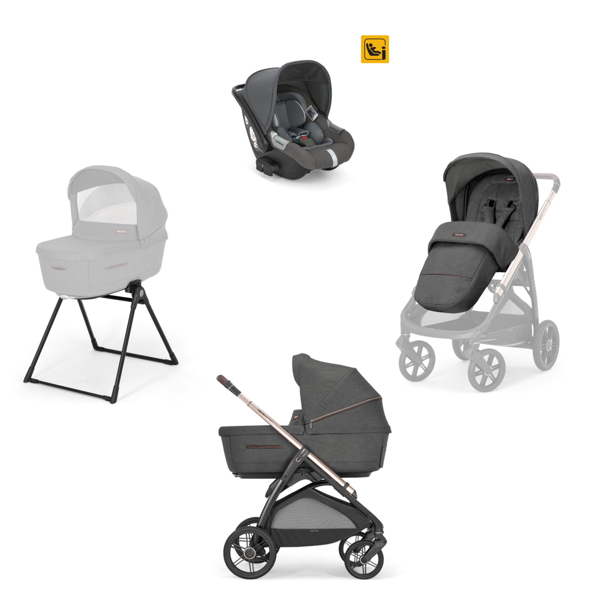 Consente la mobilità passeggio-casa-auto nella continuità del sano riposo e del sonno sicuro del bambino. Segue la crescita del bambino dalla nascita fino ai 22 kg (4 anni), dalla nanna alla passeggiata. Comprende: culla, Welcome Pad™ e materassino, Standup, seduta passeggino, coprigambe per passeggino, telaio, cestino porta oggetti, porta bibite e seggiolino auto Darwin Infant, omologato secondo il regolamento ECE R129/03 per bambini dai 40 cm fino a 75 cm di altezza (dalla nascita fino indicativamente