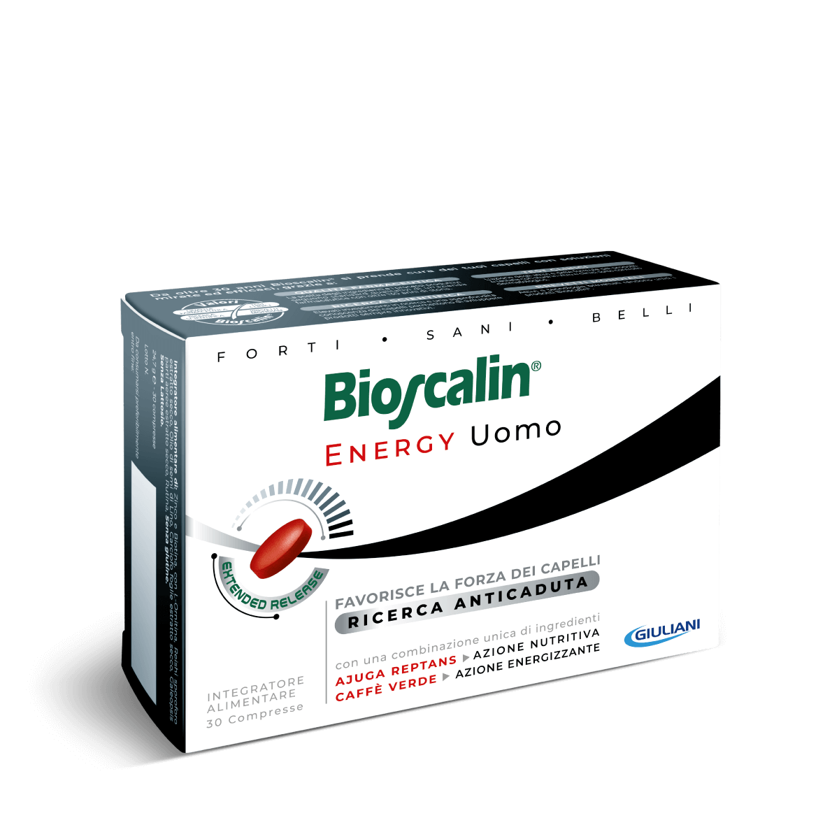 L’integratore Bioscalin Energy per i capelli dell’uomo svolge la sua azione grazie a due esclusivi complessi, operanti in combinazione con una tecnologia di rilascio brevettata in grado di veicolare in modo ottimale gli attivi, potenziandone l’azione sul capello.