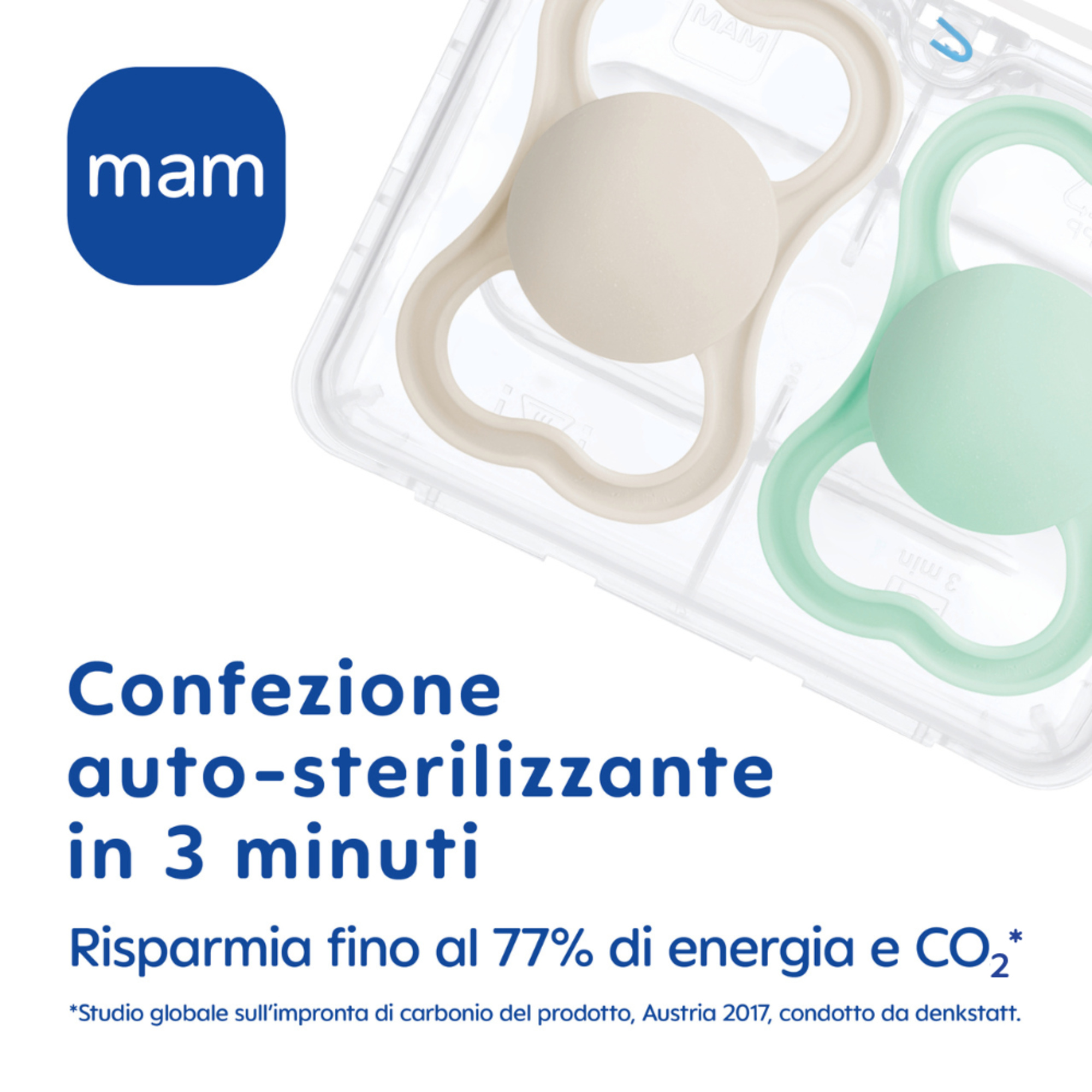 Il set da 2 ciucci MAM Original Start – specifico per neonati. La vita dei genitori cambia completamente con l’arrivo di un bebè. E’ rassicurante sapere che MAM ha sviluppato un ciuccio specifico per le esigenze dei neonati, un accessorio che aiuta a calmarli. Il ciuccio è in morbido silicone skinsoft dalla sensazione naturale, da essere istintivamente accettato dal 94% dei bimbi. Il ciuccio MAM Original Start è stato sviluppato con l’aiuto di dentisti, la tettarella si adatta perfettamente alla bocca del bimbo prevenendo malocclusioni. Grazie alla forma simmetrica, il ciuccio mantiene sempre la posizione corretta mentre la mascherina arrotondata con rilievi all’interno e i grandi fori di ventilazione prevengono sfregamenti e attriti. Il bottone facilita la maneggevolezza ma non intralcia durante il sonno, è anche possibile fissarlo con una catenella al bottone. Il set comprende due ciucci e una pratica scatolina portaciuccio, per trasportare facilmente il ciuccio e sterilizzarlo in microonde. Il succhietto MAM Original Start è perfetto per bebè di 0 – 2 mesi, risponde alla norma en 1400 ed è ovviamente senza bpa. Decorato con colori neutri, il ciuccio è perfetto per entrambi i sessi del neonato. Ricerca di mercato 2010-2023, testato con 1.588 bambini.