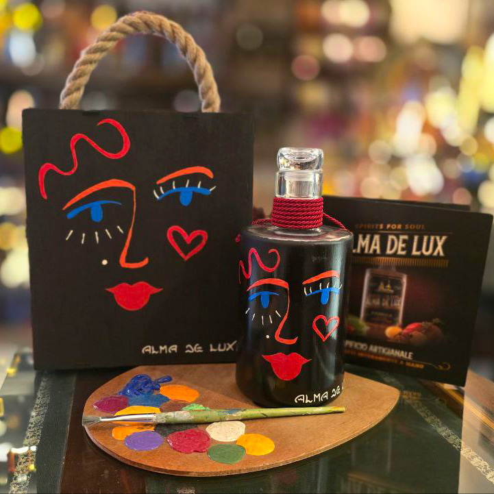 Un dono che racconta l’anima di Alma De Lux: cura, ricerca e passione. La bottiglia da 50 cl viene dipinta a mano con colori acrilici, trasformandosi in un oggetto decorativo oltre che contenitore di un liquore artigianale pregiato. La scatola in legno con chiusura scorrevole, anch’essa decorata a mano, completa la confezione rendendola un regalo raffinato e dal carattere unico. Il gusto va scelto dal cliente e inserito tra le note dell’ordine al momento dell’acquisto (escluso gusto Sigaro).