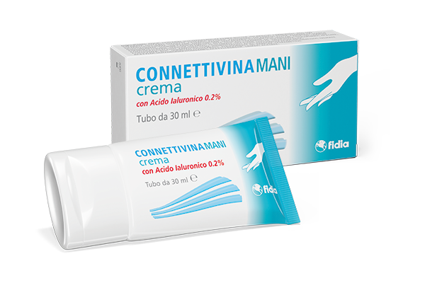 CONNETTIVINAMANI crema è una preparazione topica a base di Acido Ialuronico 0,2%, indicata per il trattamento locale e temporaneo delle mani molto secche, screpolate, arrossate e più in generale stressate da agenti esterni e dal freddo.