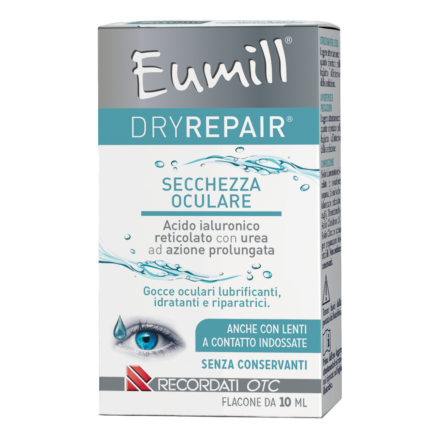 Eumill DryRepair è una soluzione sterile per uso oftalmico con pH fisiologico a base di acido ialuronico reticolato – 0,4% – con urea, secondo una tecnologica brevettata, così da aumentare e migliorare le naturali proprietà meccaniche dell’acido ialuronico, rendendolo in grado di resistere più a lungo alla degradazione da parte delle ialuronidasi rispetto all’acido ialuronico naturale.