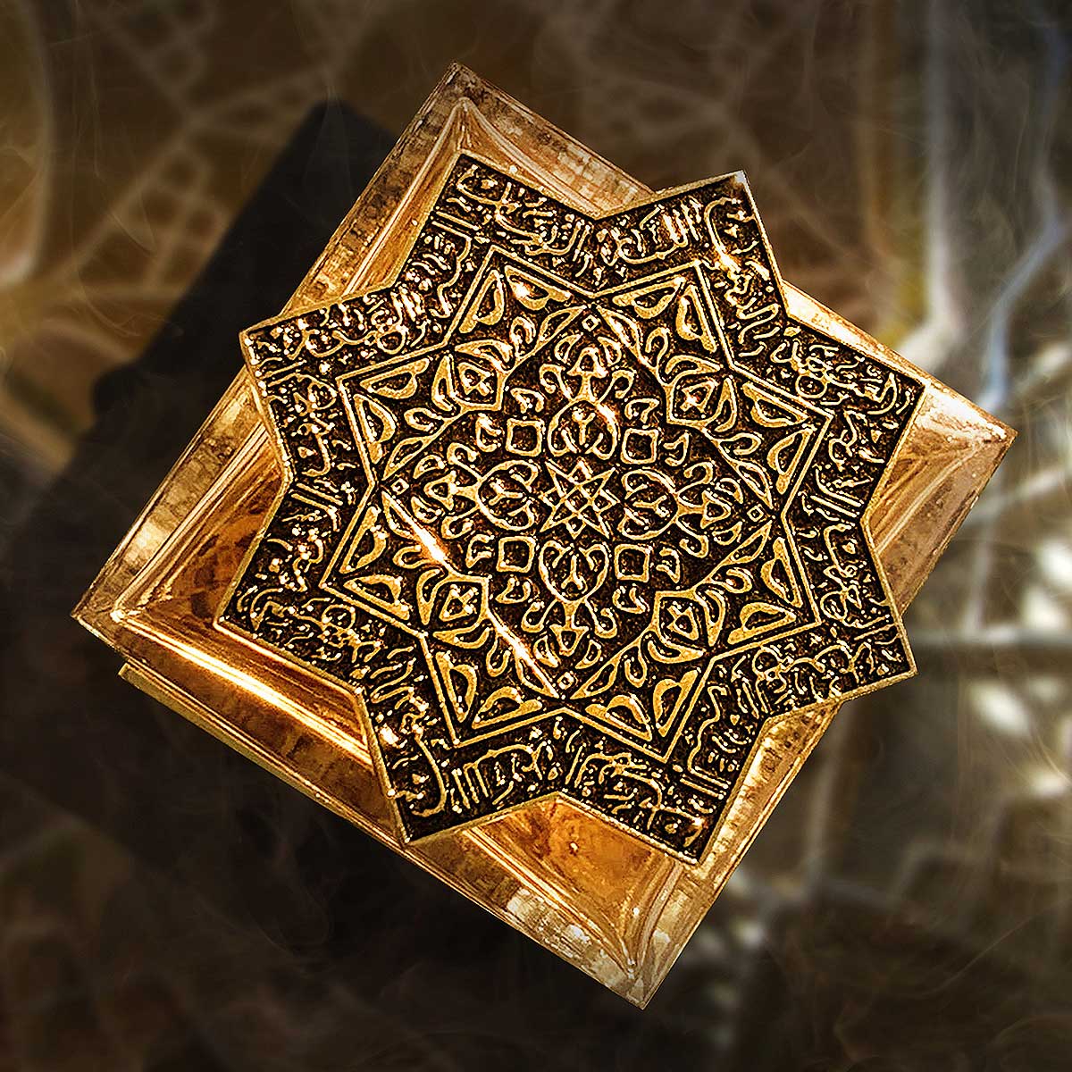 Il design del tappo di Kajal Dahab è una stella a otto punte, inizialmente forgiata con una particolare piastrella in pasta di pietra (si utilizzava questo metodo già dalla seconda metà del XIII secolo d.C. a Ilkhanid, Iran). Il design del tappo richiede un duplice processo: in primo luogo, vengono inseriti gli otto nomi dell’oro. Viene poi rielaborata l’originale piastrella in pasta di pietra Arabesque, tenendo conto della qualità artigianale e del design, in modo che non sembri troppo raffinata. Dopo aver aggiunto i segni diacritici completi ai nomi ed averli uniti, vengono combinati con la parte floreale, per produrre la versione finale (come nel disegno proposto).