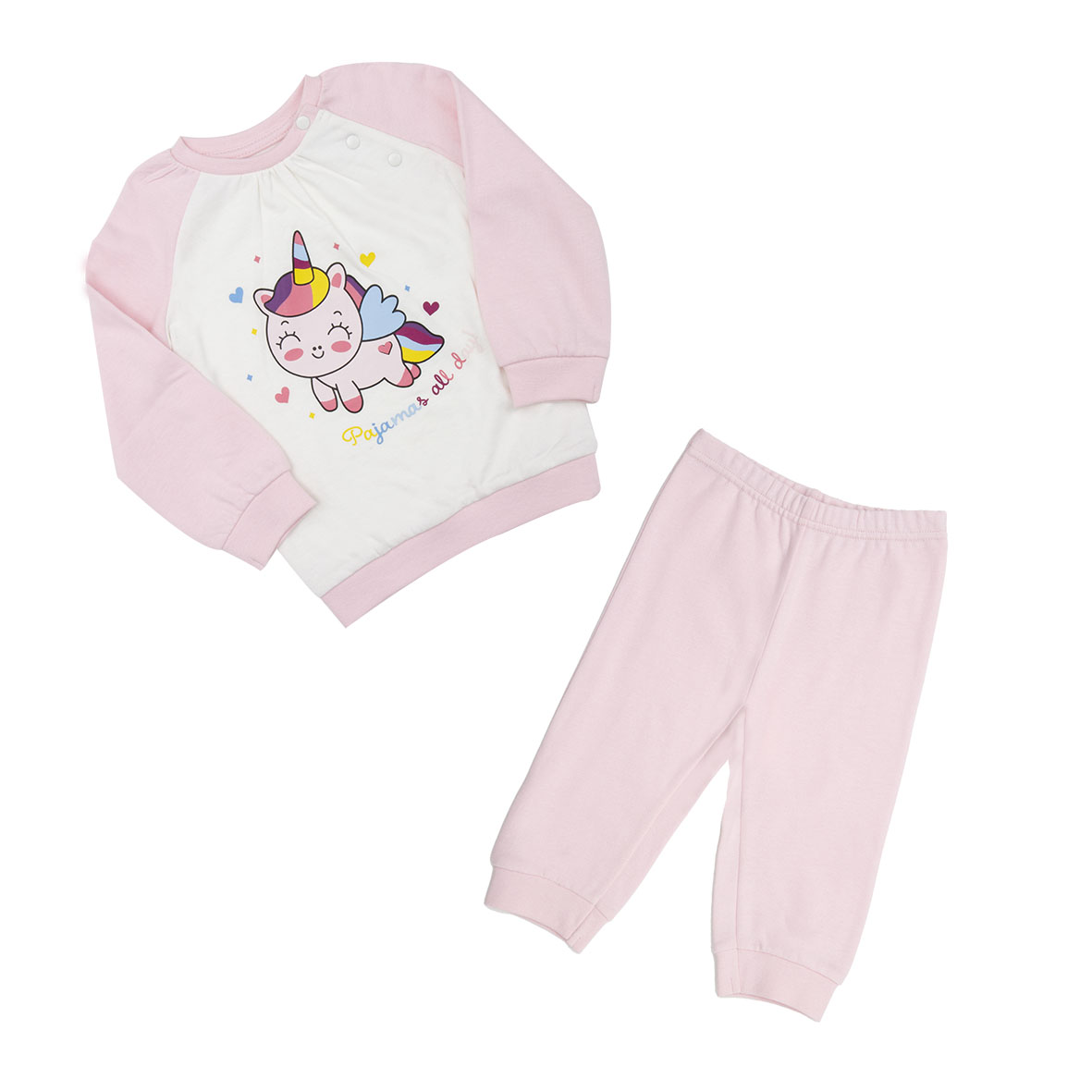 Pigiama in morbida felpa mano calda, raglan bicolore con stampa. L’apertura sulla spalla e le morbide costine conferiscono maggior comfort al capo.