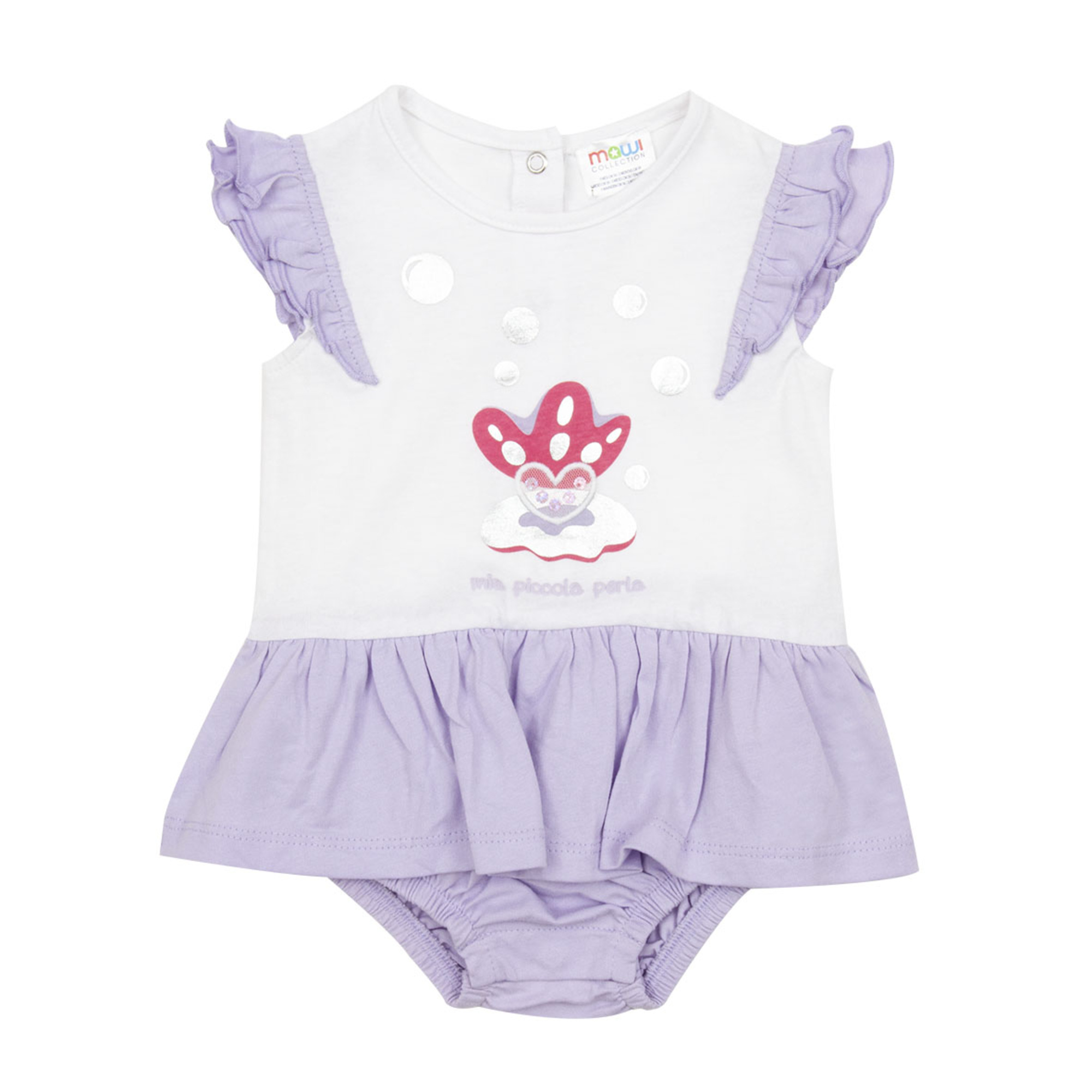 Delizioso pagliaccetto in morbido jersey con gonna a balze e rouches sulle spalle. Il capo è reso prezioso da applicazione di tulle e paillettes. Oltre all’apertura sul retro, presenta una comoda apertura entrogamba per facilitare il cambio del pannolino. Modello certificato oeko-tex.