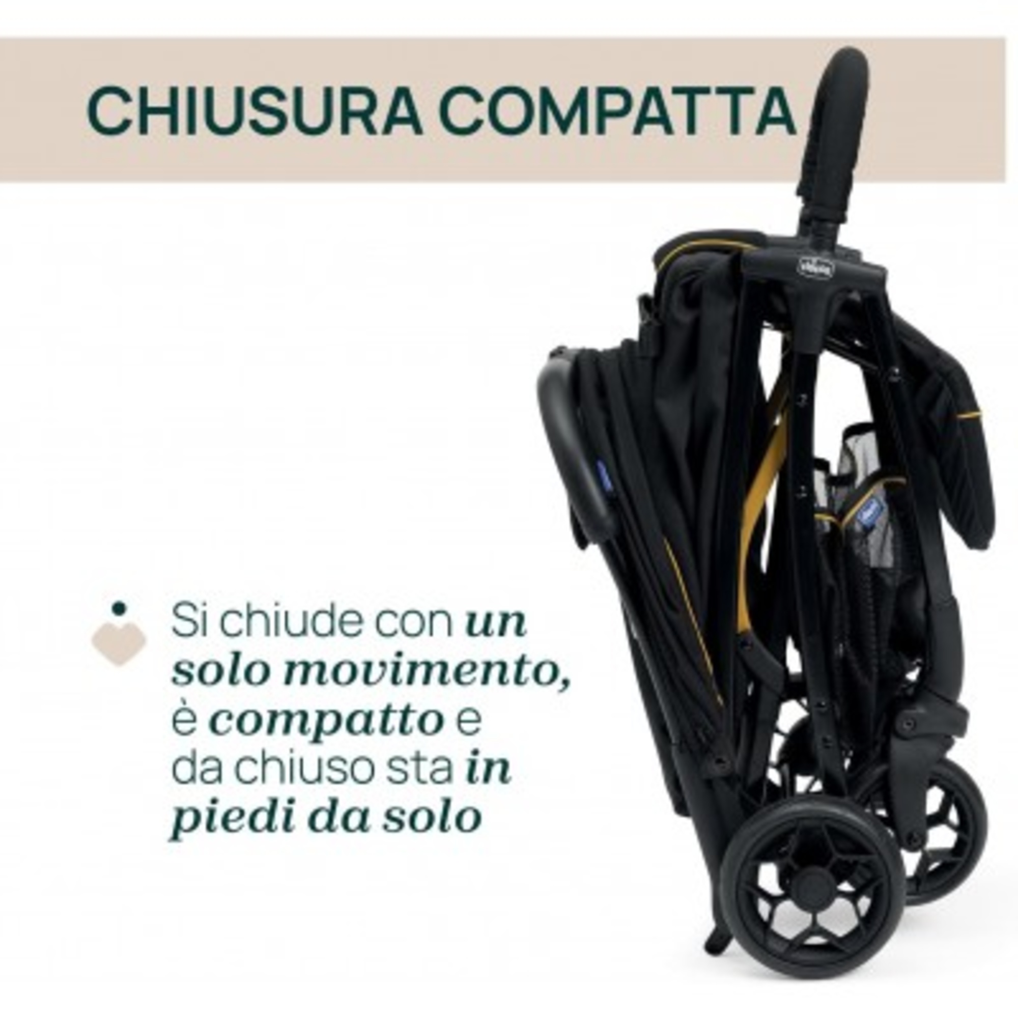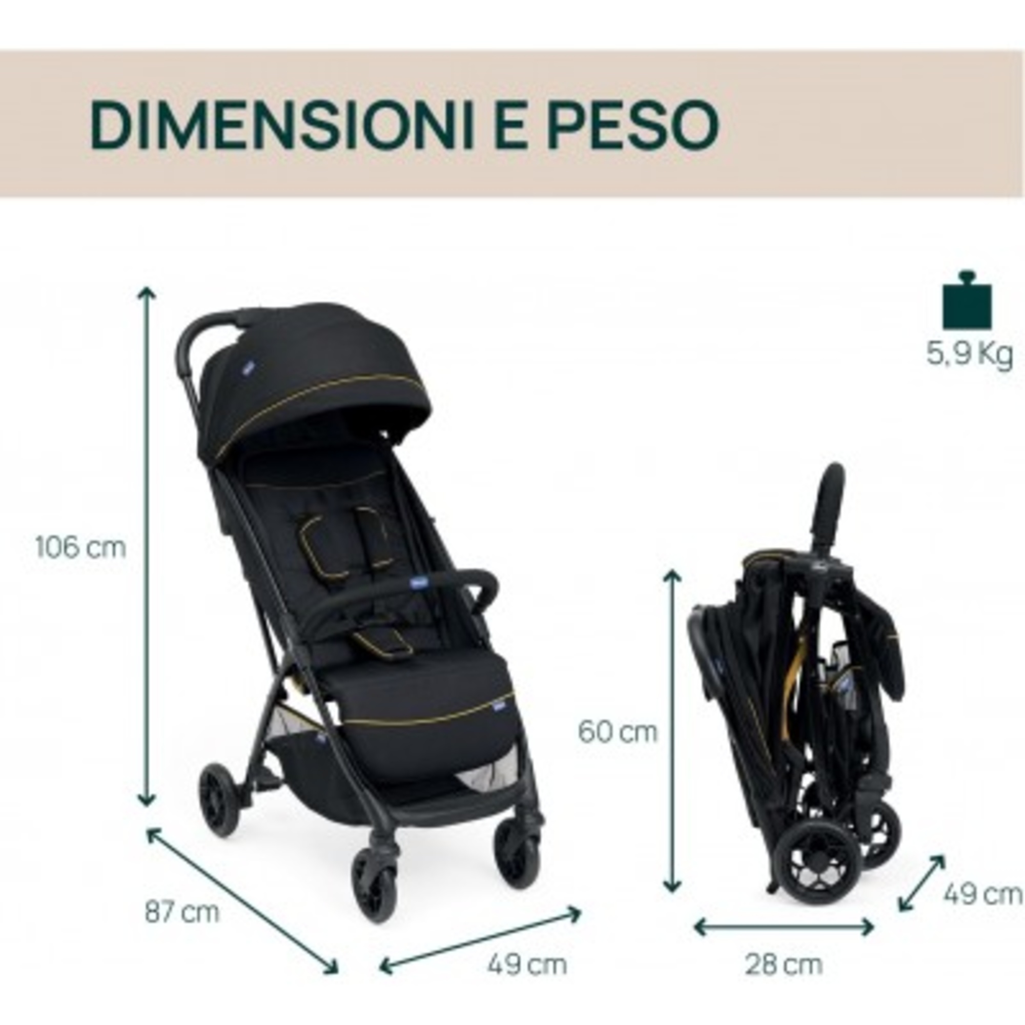 Il passeggino si chiude con un solo movimento ed è leggerissimo: pesa solo 5,9 kg!