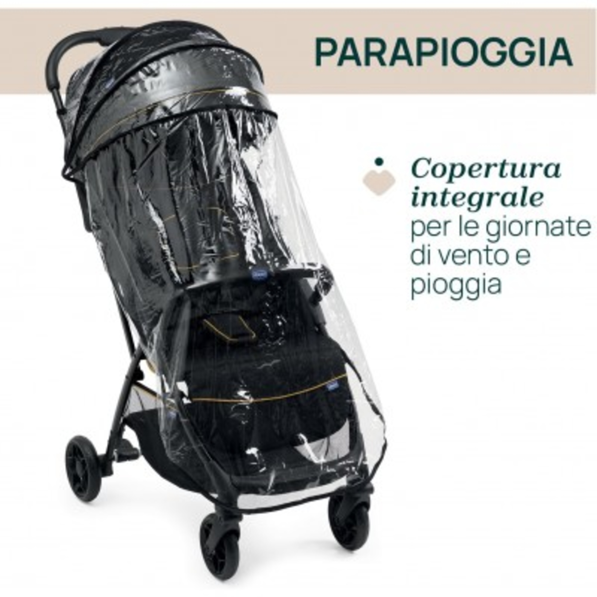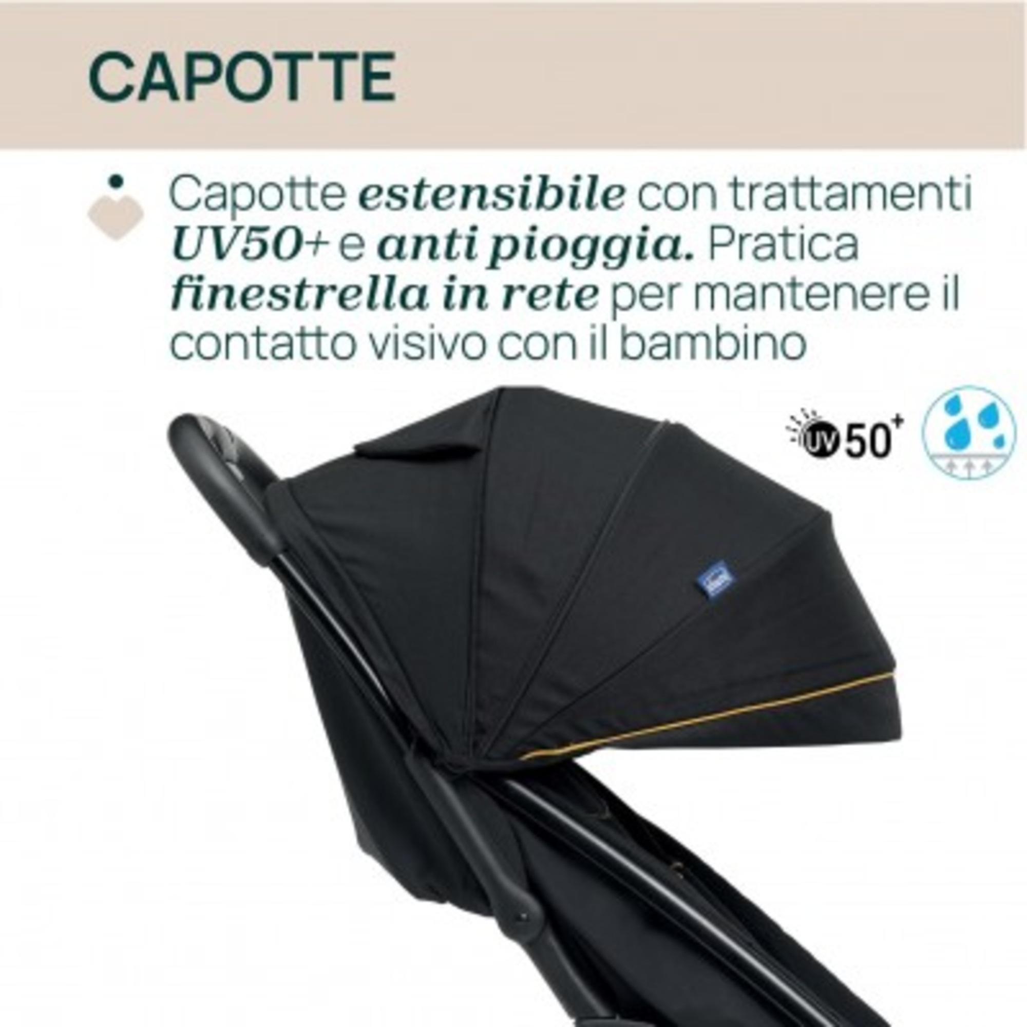 La cappottina di protezione presenta una parte estensibile ed è dotata di parasole. La stessa viene sottoposta a trattamenti UV50+ e idrorepellenti.