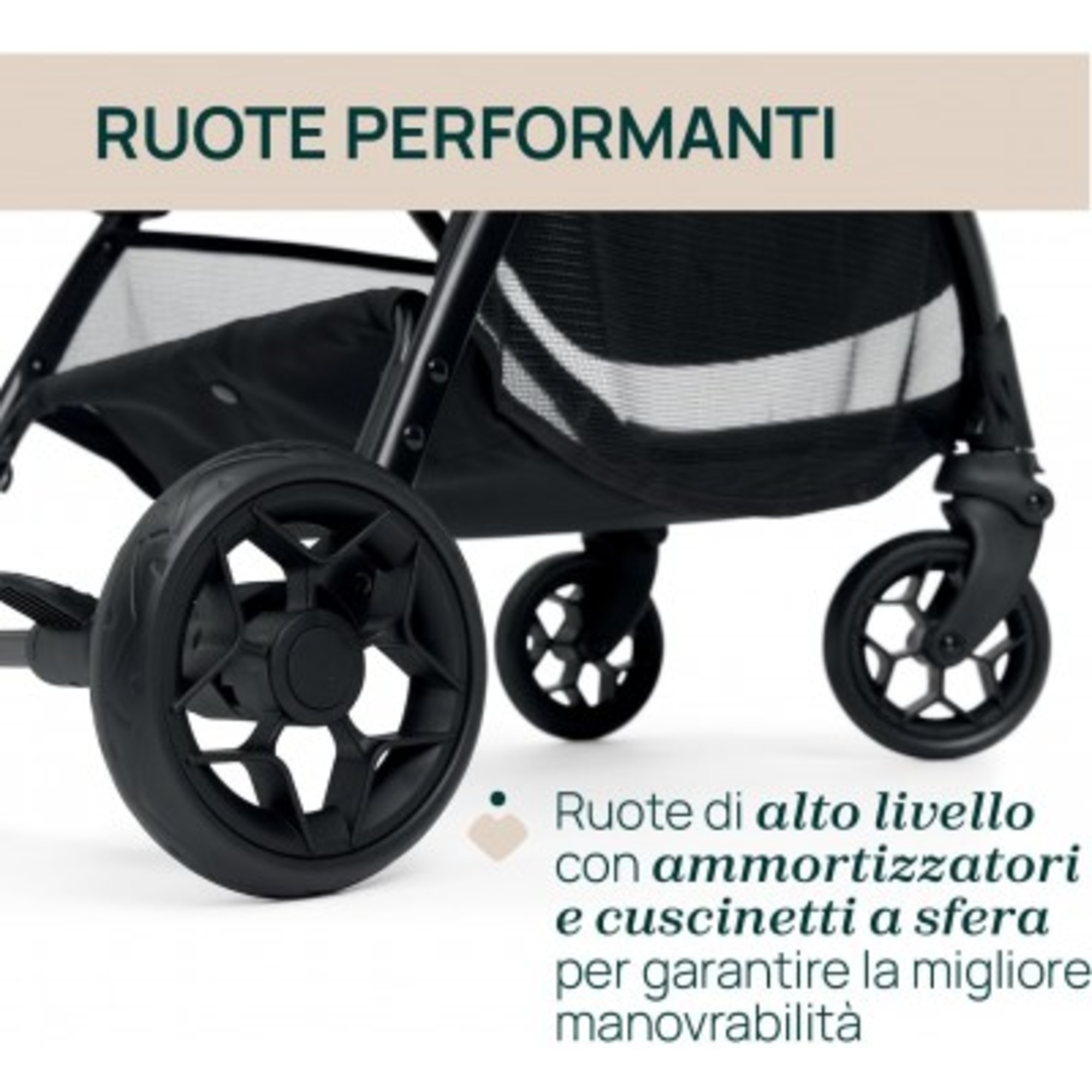 Le ruote dalle elevate prestazioni, dotate di cuscinetti a sfera e ammortizzatori, garantiscono la massima manovrabilità su ogni tipo di superficie.
