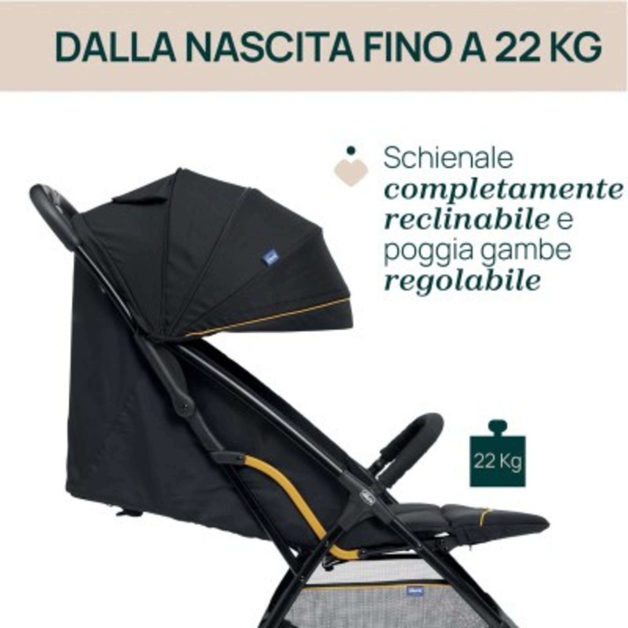 Glee dispone dell’omologazione dalla nascita fino a 22 kg grazie allo schienale completamente reclinabile e al poggiapiedi regolabile.