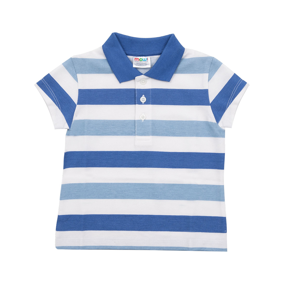 Magliettina polo da bambino. Il capo si presenta con linee orizzontali blu azzurre e bianche. Modello con colletto e bottoni. La vestibilità è morbida e pratica grazie ai bottoni classici sul davanti. La maglietta è facilmente combinabile per un look casual/sportivo. Accessori non in vendita. La confezione contiene solo il capo d’abbigliamento