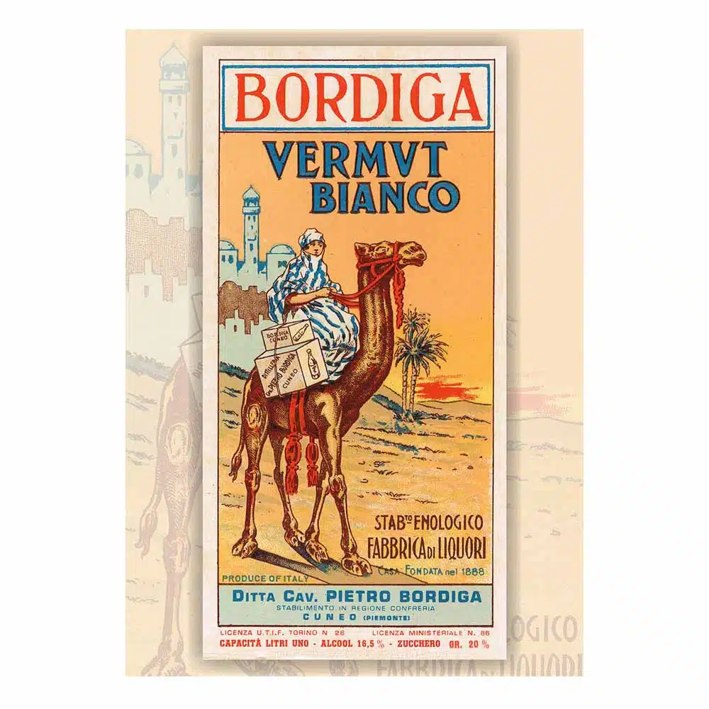 Un poster che racconta la storia della Bordiga e dei suoi pregiati Vermouth. Il cammello ci riporta agli anni in cui è stata fondata l’azienda nel lontano 1888. Proprio in quegli anni l’Italia iniziava la sua espansione coloniale nelle terre dell’Eritrea e della Somalia e, molti produttori di generi alimentari, mostravano il proprio appoggio alle politiche italiane esibendo in etichetta un riferimento a queste terre lontane. Così, per celebrare il momento storico italiano, anche Bordiga scelse l’immagine di un cammello per l’etichetta del suo Vermouth, simbolo del mezzo di trasporto con il quale il Vermouth Bordiga arrivava alle colonie e, dalle colonie, traghettava le spezie esotiche rare e preziose utilizzate per la sua preparazione. Oggi come allora, queste spezie, saggiamente miscelate all’ottimo vino del Piemonte e alle eccellenti erbe officinali alpine raccolte a mano, danno vita al Vermouth Bordiga.