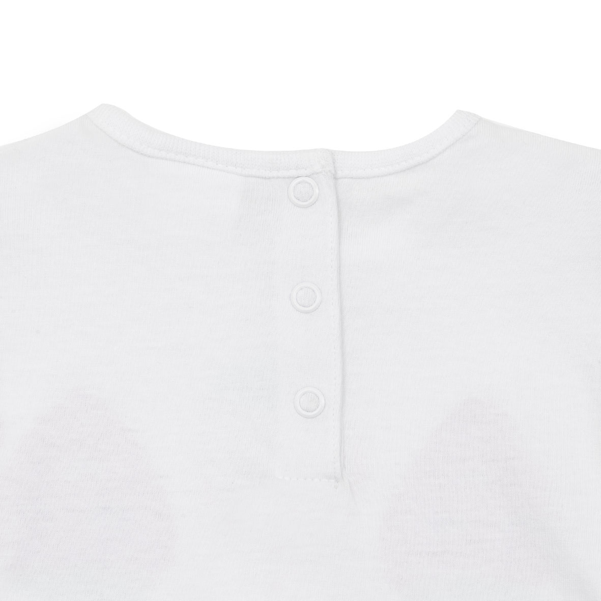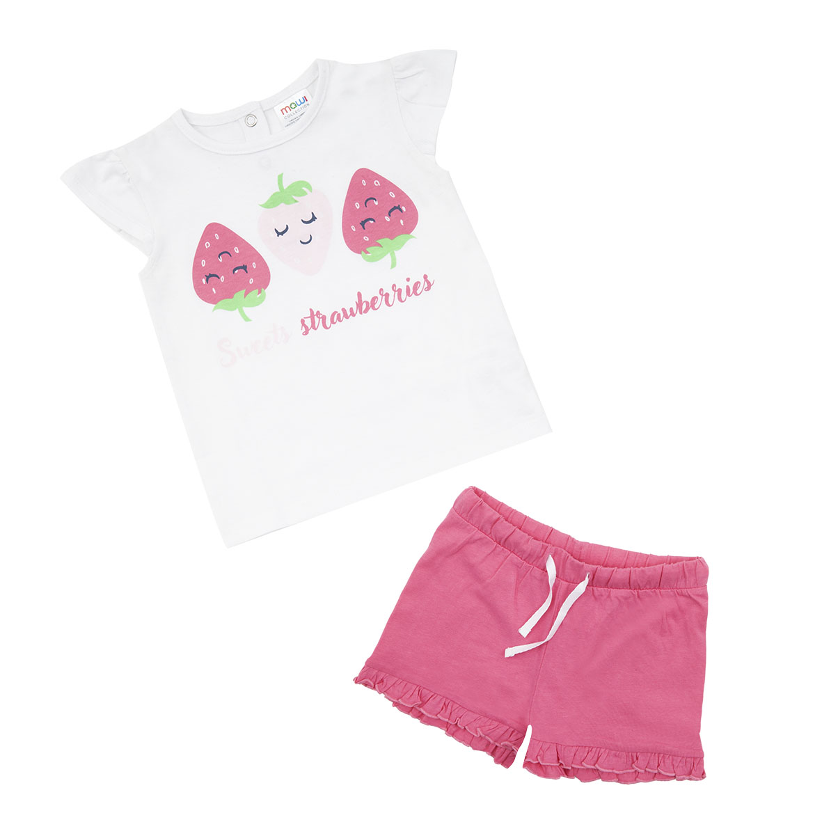 Canotta e shorts jersey da bambina. Il capo superiore si presenta in total bianco con stampa fragole grandi sul davanti, presenti rouches sul giromanica e comodi bottoni a clip sul retro per massimizzare la comodità e la praticità; il capo inferiore abbinato si presenta di colore rosa con rouches sul girogamba e comodo elastico regolabile in girovita.
