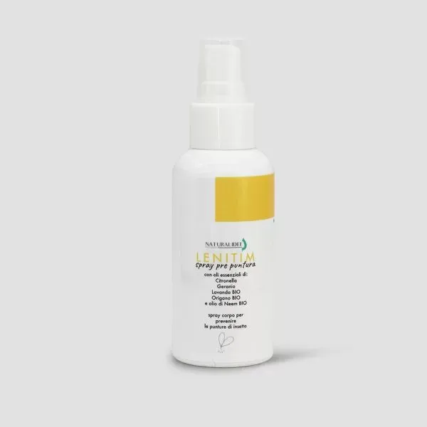 Lenitim spray pre punture, è un trattamento specifico capace di creare un ambiente sgradevole per gli insetti e le zanzare riuscendo così ad allontanarle. La formula è potenziata dalla Glicerina Vegetale che idrata e ammorbidisce la pelle, facilitandone l’assorbimento e dall’olio di NEEM, un potente repellente naturale