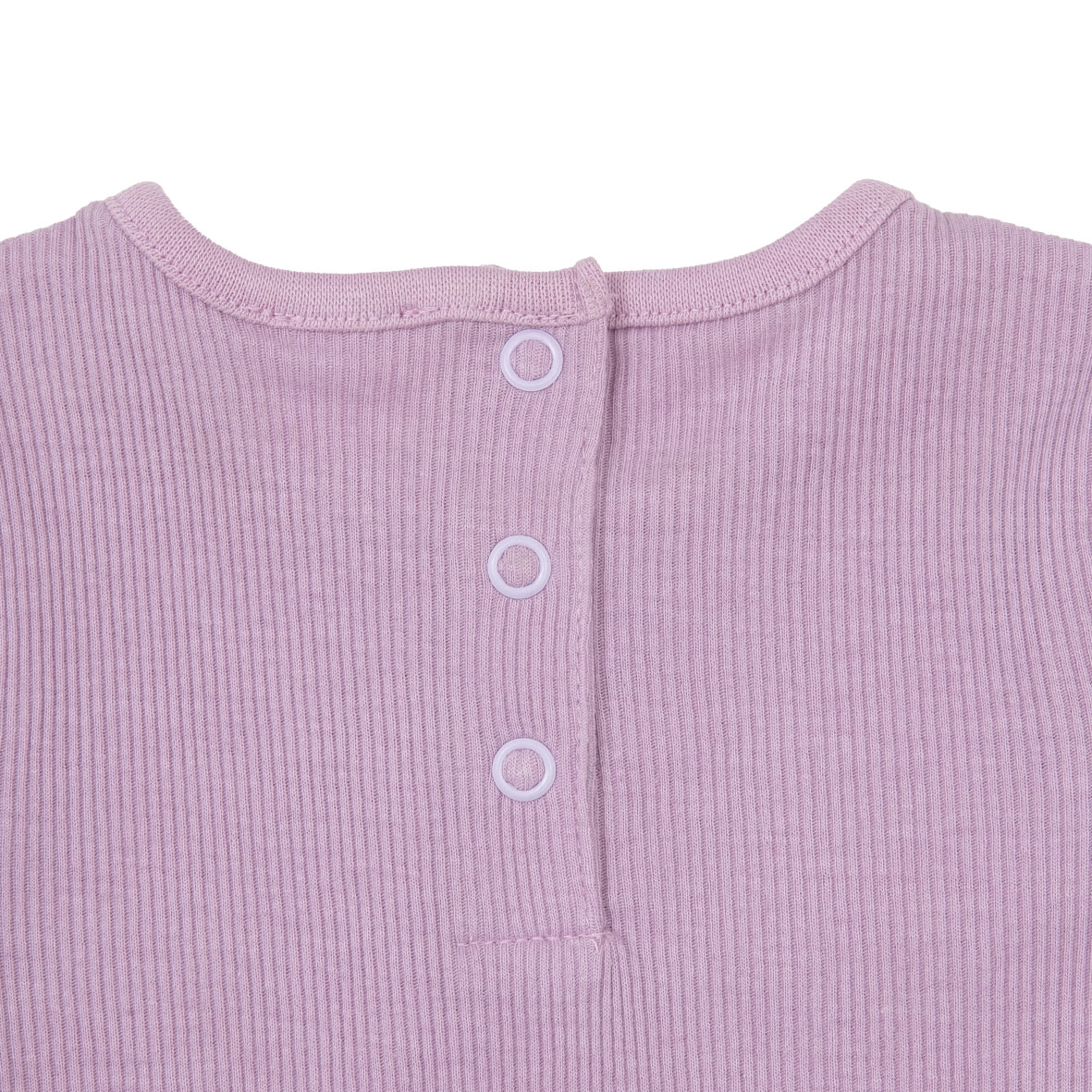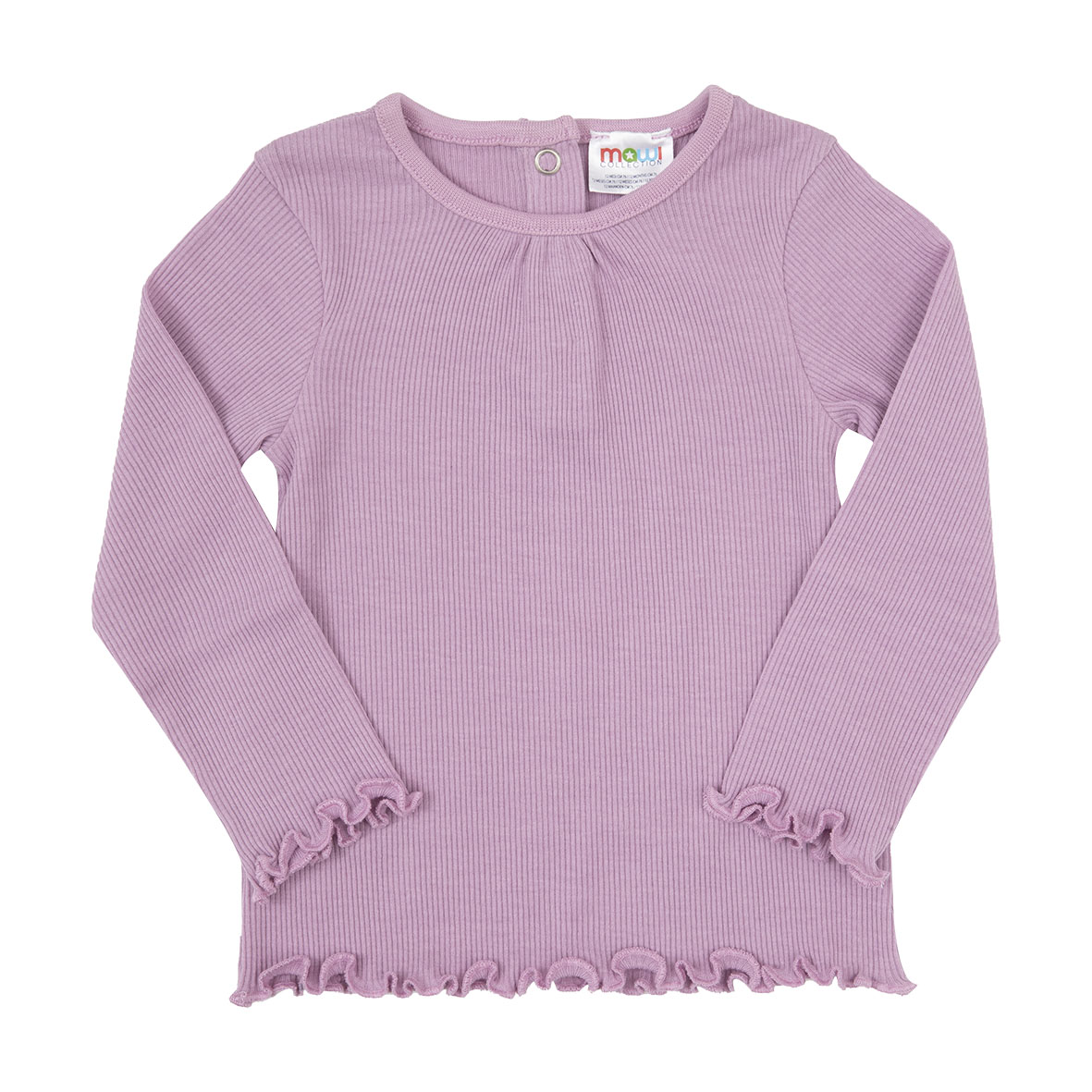 Maglia manica lunga da bambina. Il capo semplice si presenta in tinta unita lilla con trama verticale. Presenti rouches su giromanica e girovita. La vestibilità è morbida e pratica grazie ai bottoni a clip sulla schiena. La T-shirt è adatta per occasioni casual e facilmente combinabile. Accessori non in vendita. La confezione contiene solo il capo d’abbigliamento